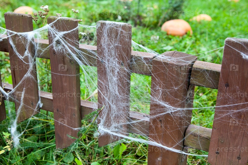 Большая паутина на деревянном заборе и спелые тыквы на зеленой траве в саду