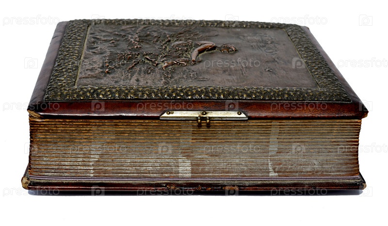 Старая книга с гравировкой на кожаной обложке, изолированная на белом фоне