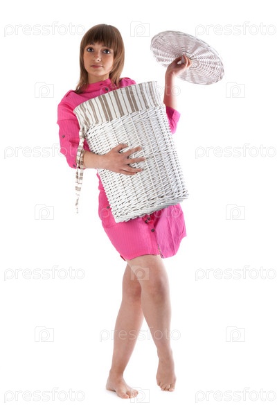 Девушка в розовом платье с корзиной для белья, изолированная на белом фоне