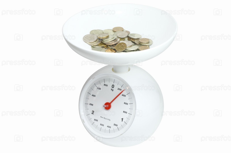 Куча монет на кухонных весах