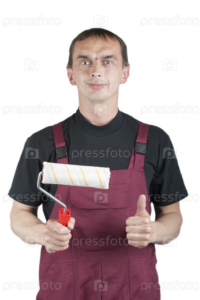 Маляр с валиком на белом фоне