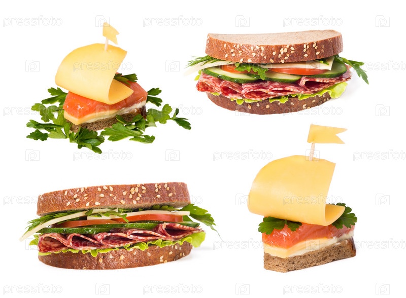 Коллекция бутербродов с красной рыбой и колбасой на белом фоне