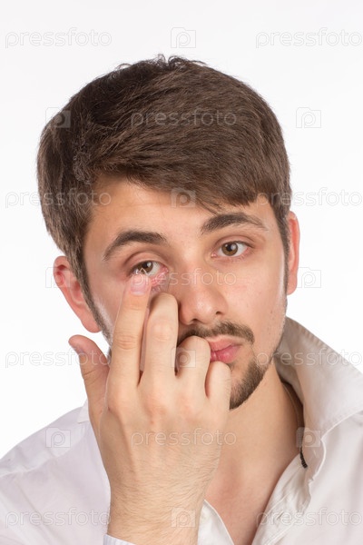 Кареглазый мужчина ставит корректирующие контактные линзы