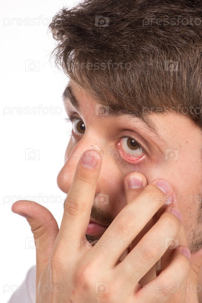 Кареглазый мужчина ставит корректирующие контактные линзы