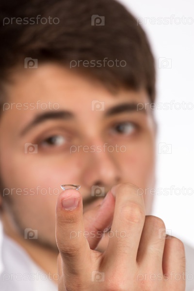Кареглазый мужчина ставит корректирующие контактные линзы