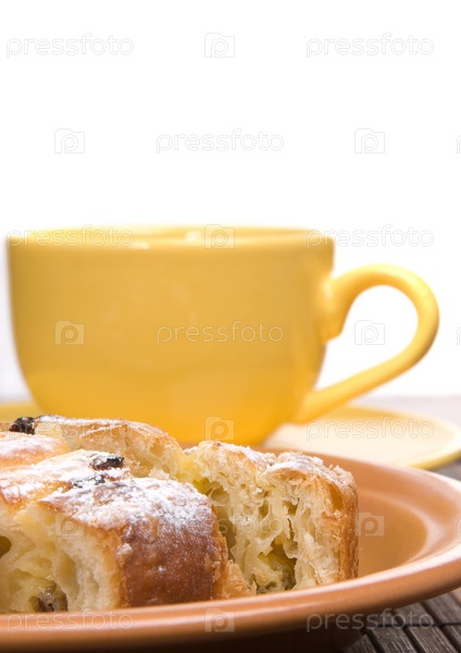 Кусок сладкого пирога и чашечка с чаем