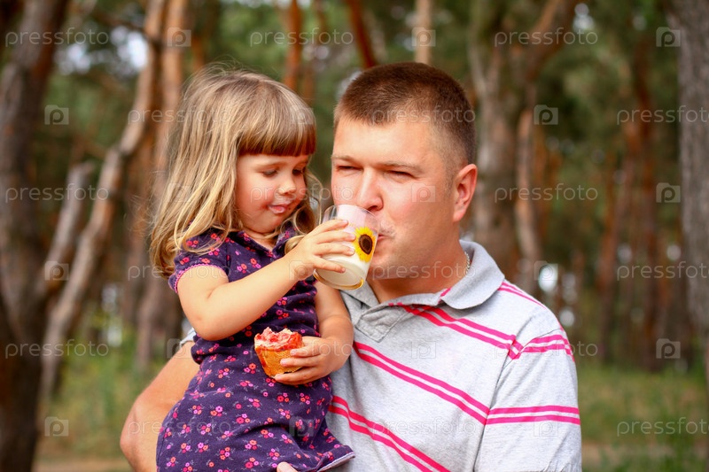 Пикник в лесу, дочь дает отцу молоко