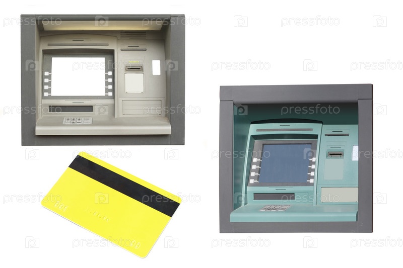 Банкоматы и кредитная карта на белом фоне