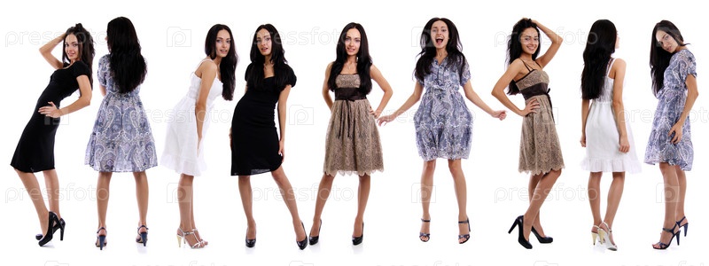 Темноволосая девушка в разных платьях, изолированная на белом фоне