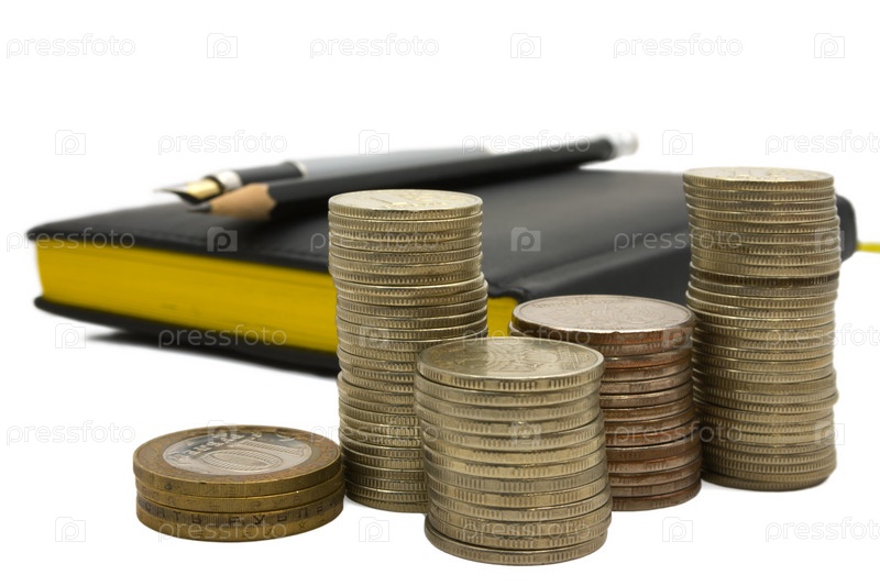 Монеты и дневник с ручкой на белом фоне - бизнес натюрморт