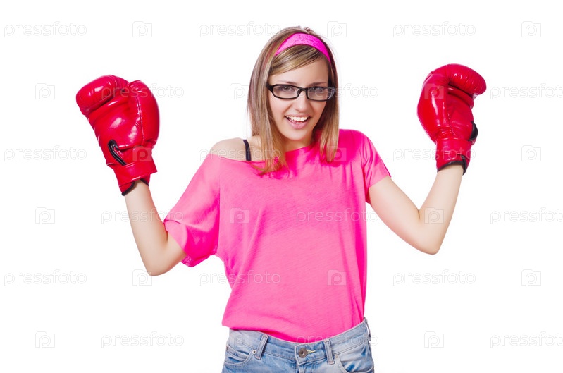 Молодая женщина с боксерскими перчатками на белом