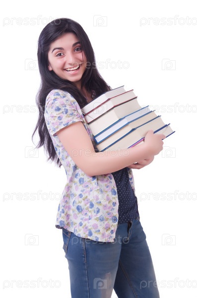 Девушка студент с книгами на белом