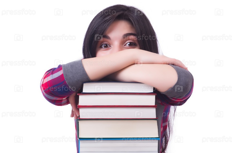 Девушка студент с книгами на белом
