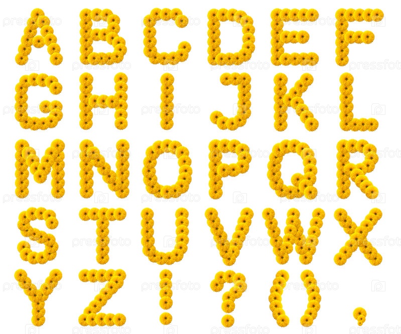 Буквы алфавита их желтых цветов, изолированные на белом фоне