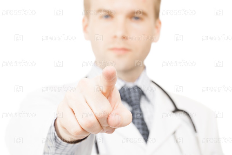 Доктор указывает пальцем на белом фоне