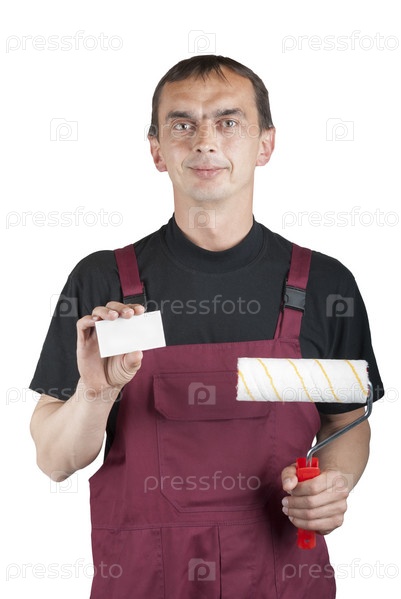 Маляр в рабочем комбинезоне с валиком и визиткой в руках