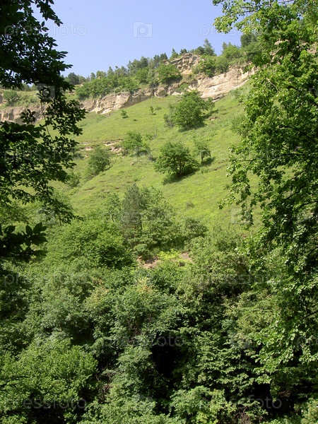 Яркие зеленые кроны деревьев на фоне крутого склона и скал, Кисловодский курортный парк, Кавказ