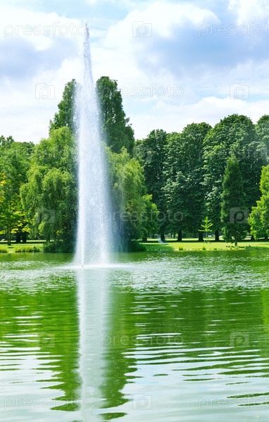 Красивый пейзаж с видом на озеро, фонтан и парк