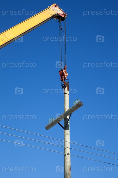 Кран устанавливает деревянную электрическую опору