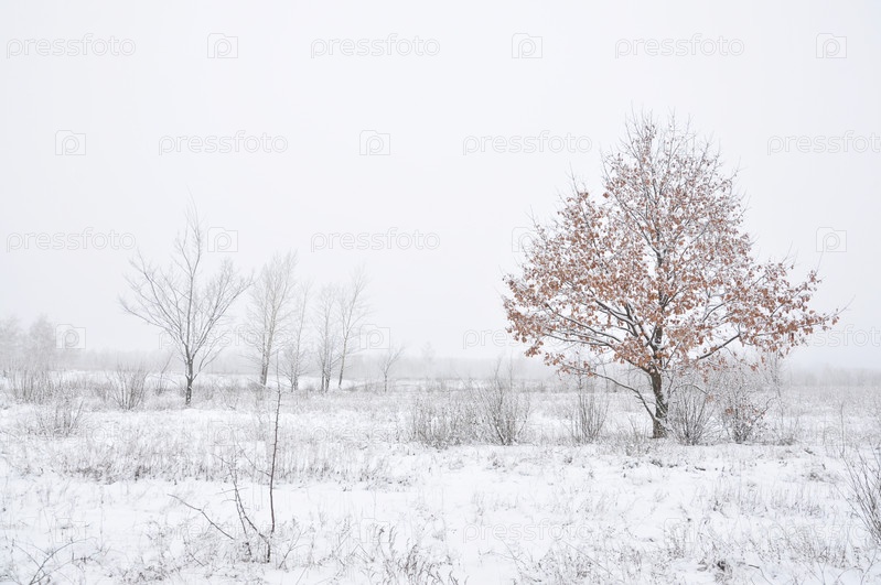 Молодой дуб растет зимой