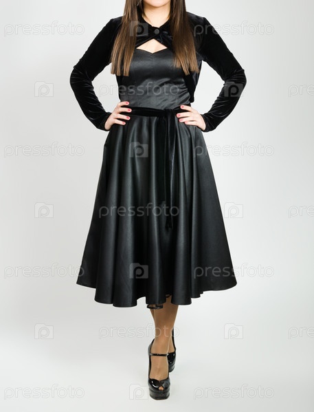 Анонимная женщина демонстрирует модную одежду на сером фоне