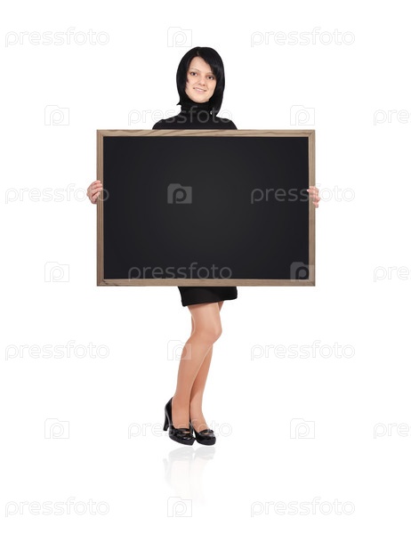 Девушка держит доску на белом фоне