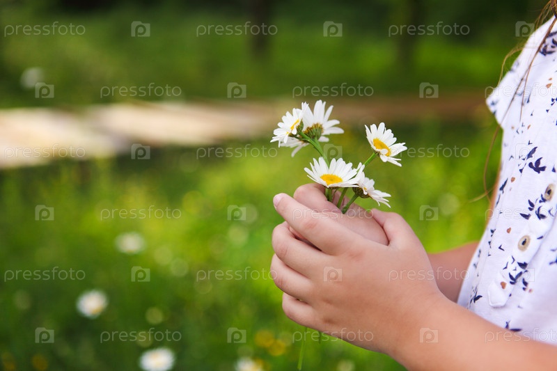 Ромашки в руках ребенка. Солнечный весенний фон. Крупным планом