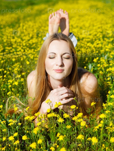 Молодая красивая блондинка лежит на поле с ромашками