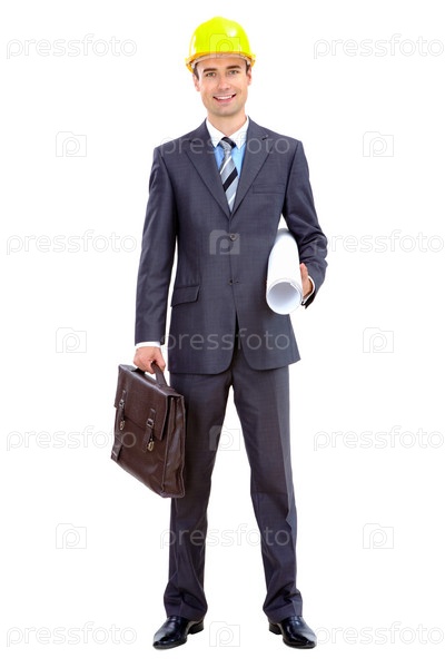 Инженер в деловом костюме и строительной каске, изолированный на белом фоне