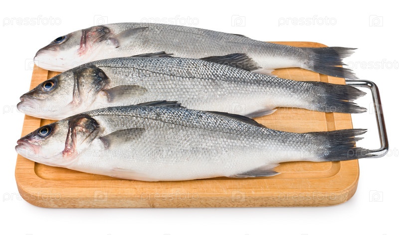 Морской окунь на деревянной доске, изолированный
