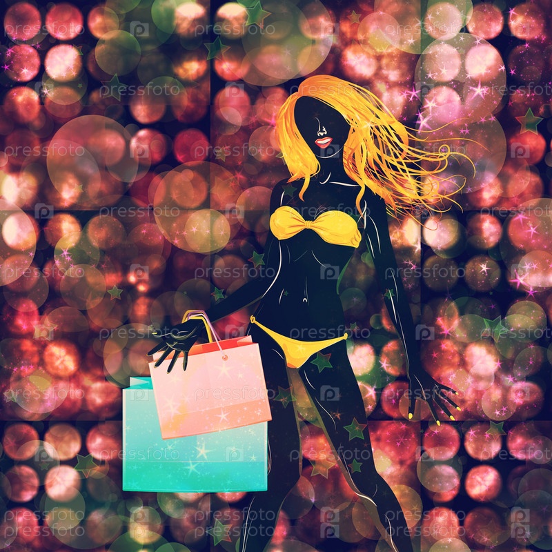 Девушка в желтом бикини с покупками