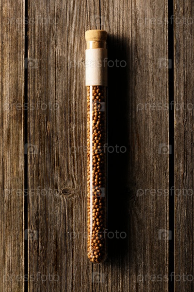Кориандр в пробирке на деревянном столе