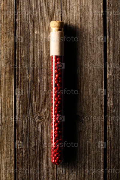 Розовый перец в пробирке на деревянном столе