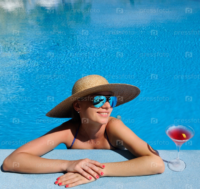 Женщина в бассейне с коктейлем космополитен