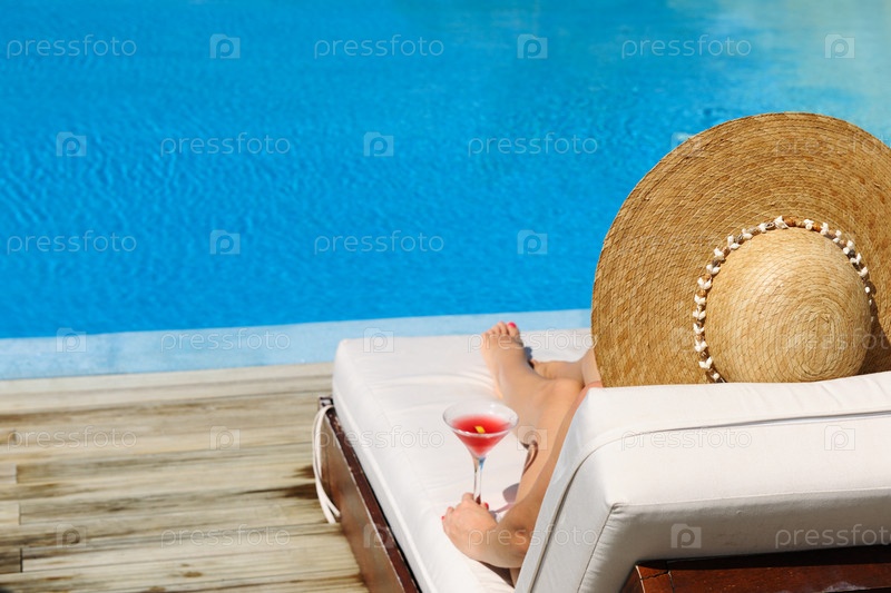 Женщина у бассейна с коктейлем космополитен