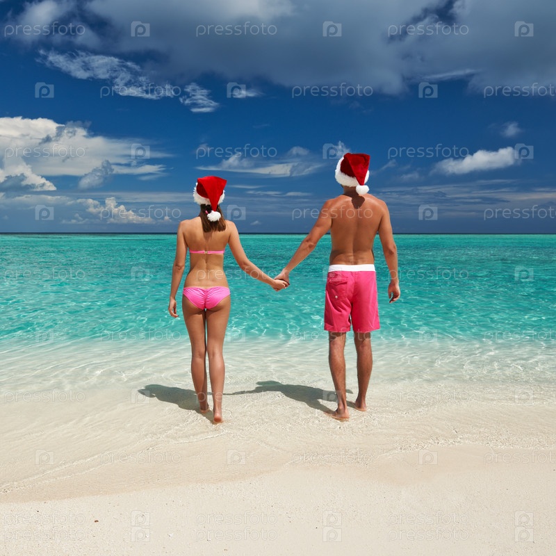 Пара в шапках Санта-Клауса на пляже на Мальдивах