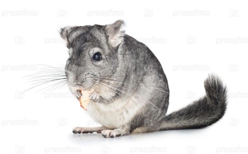 Серебряная шиншилла ест на белом
