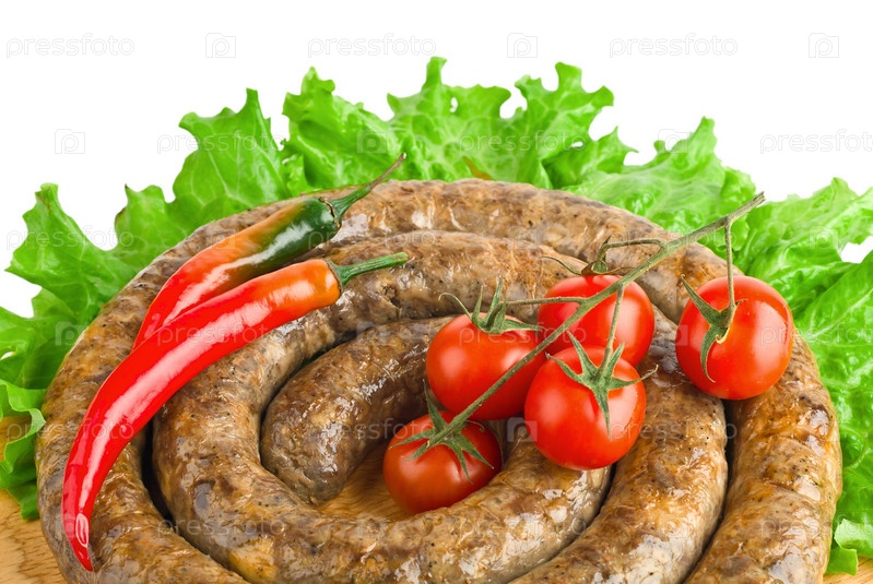 Жаренная колбаса с листьями салата, крупный план