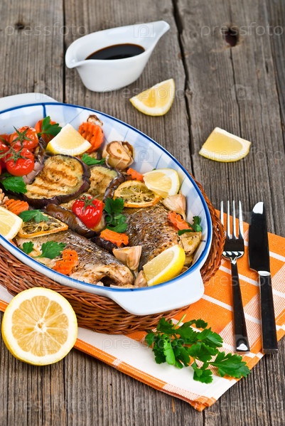 Рыба сибас, запеченная с овощами, травами и лимоном
