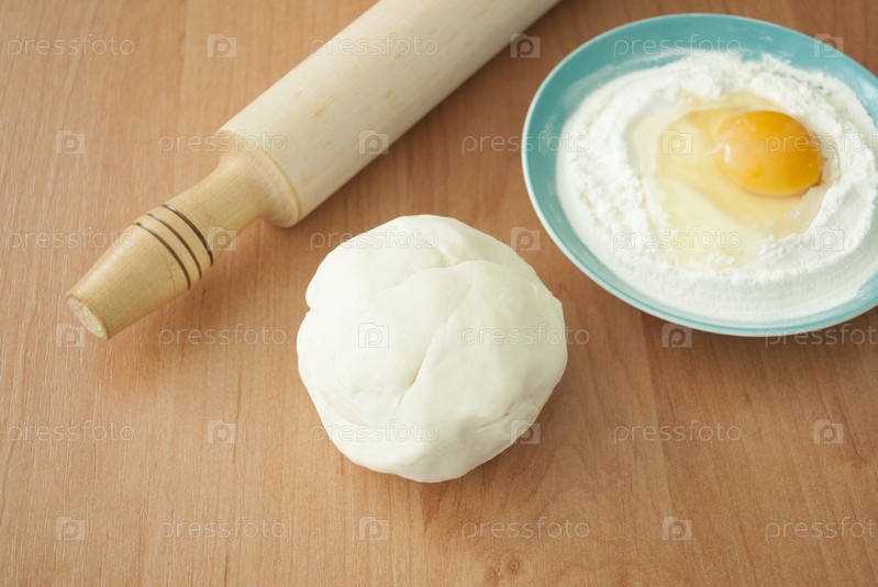 Деревянная скалка, тесто и тарелка с мукой и яйцом