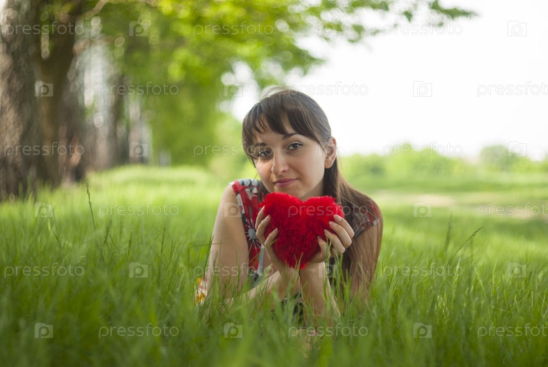 Счастливая девушка лежит на траве с красным пушистым сердцем в руках
