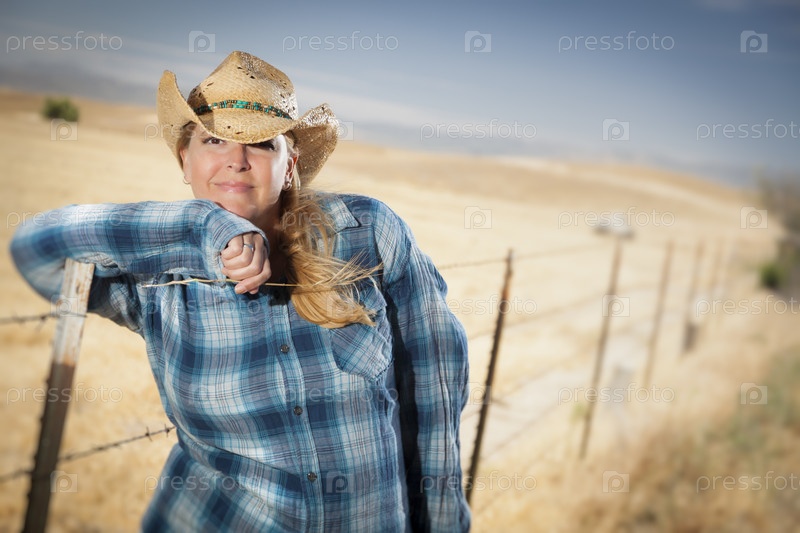 Красивая фермерша у забора в поле