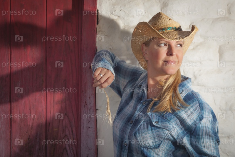 Красивая фермерша на фоне старой стены и красной двери