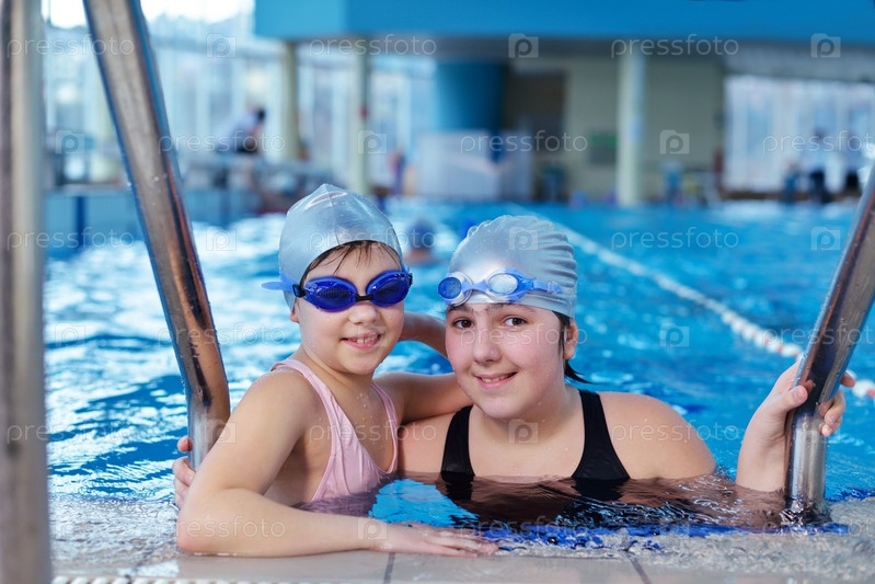 Счастливые дети в плавательном бассейне