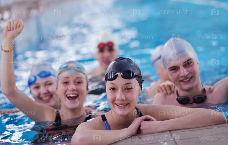 Счастливые дети в плавательном бассейне