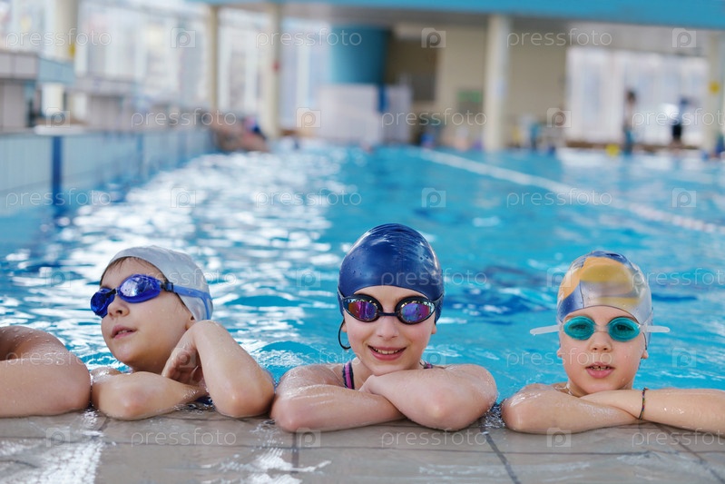 Счастливые дети в плавательном бассейне