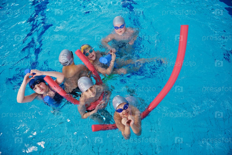 Счастливые дети в плавательном бассейне