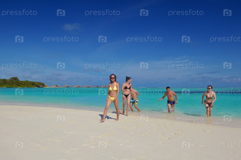 Группа счастливых молодых людей отдыхает на пляже