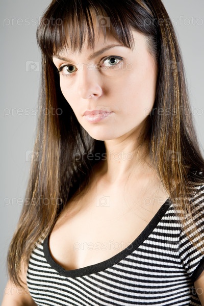 Молодая красивая девушка в блузке на сером фоне