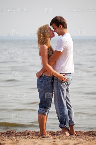 Молодая пара обнимается на пляже